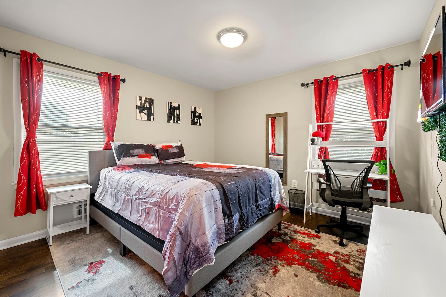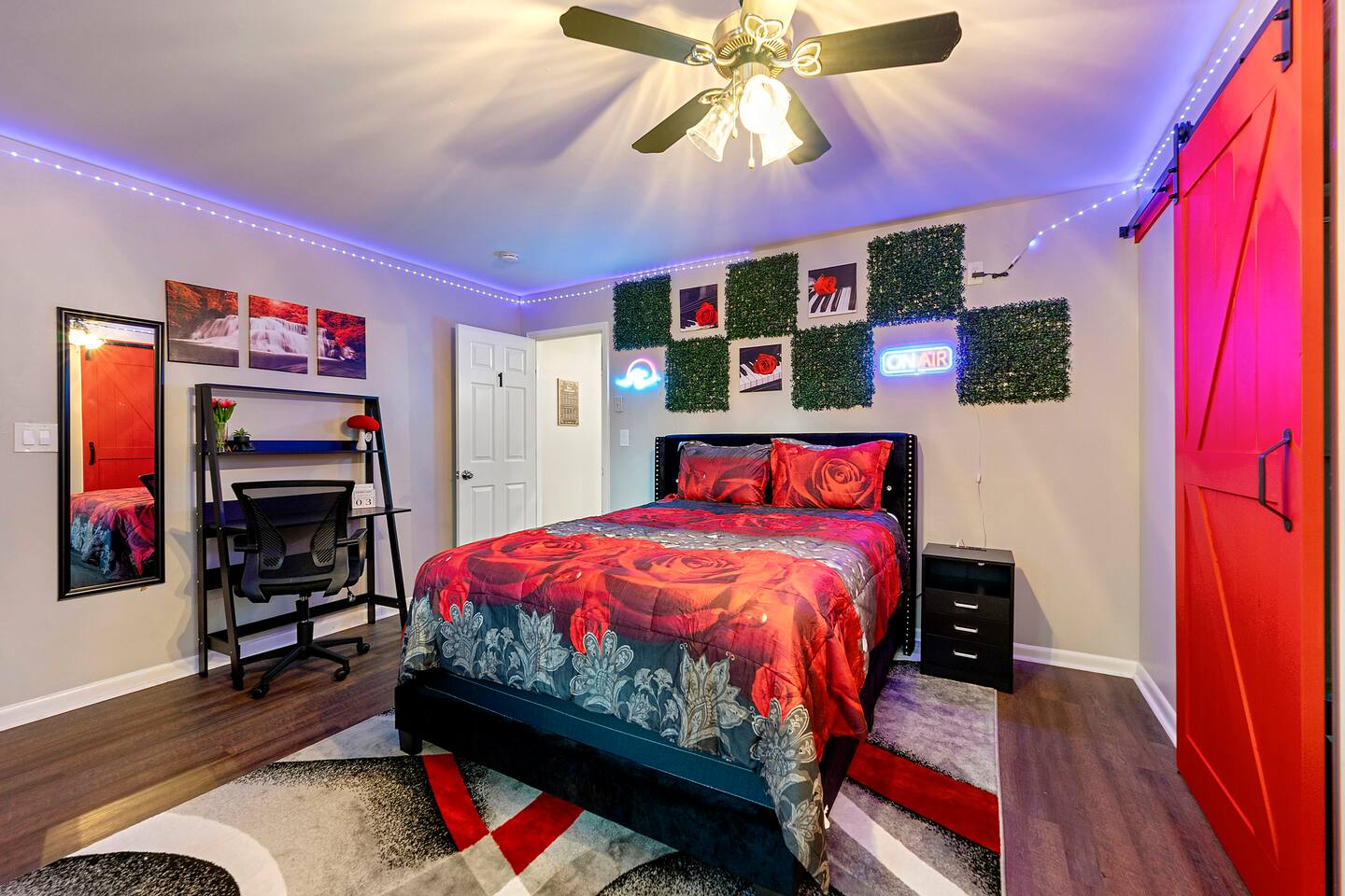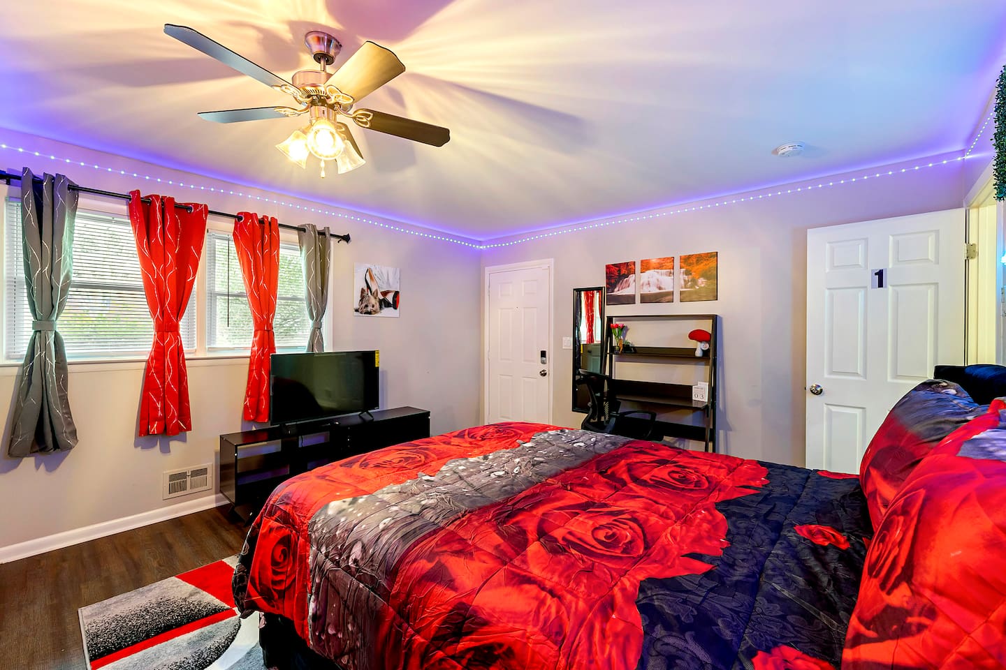 Welcome to your away from home, we look forward to hosting you! The Big Red House is great for individuals needing an immaculate, spacious and an overall great experience during their stay! The Big Red House is close to everything in the city nightlife and fun activities. Whether you want to stay in and have a game night or engage in all the city and surrounding areas fun activities has to offer, you will get the best of both worlds! We offer clean, sanitized and safe living area LIVING ROOM * The perfect place for your entertainment encounter, whether it be to binge watch your favorite show or enjoy a movie! *55" Smart TV with free Crunchyroll, Hulu and Disney + ENTERTAINMENT ROOM *This area is located next to the kitchen and is the perfect location for guest to gather for meals, going against your frenemies in Uno, Jenga, Taboo and other provided board games. *55" Smart TV with free Crunchyroll, Hulu and Disney + KITCHEN *Grab a morning cup of coffee/tea/hot chocolate from our Coffee maker *Kitchen includes stainless steel refrigerator, range, microwave, toaster, waffle maker and dishwasher. *Includes everything needed for your culinary creations such as pots, pans, knives, utensils, plates, etc. BEDROOMS AND BATHROOMS *Picturesque spacious bedroom with lots of natural light *Queen Sized Comfortable Bed with extra pillows **Private bathroom and shower** *32" & 40" Smart TVs with included Crunchyroll, Hulu and Disney+ *Multiple, easily accessible, USB ports. LAUNDRY ROOM *Guest have full access to the washer and dryer units located in the laundry room adjacent to the kitchen *SECURITY CAMERA ** The property is equipped with Ring cameras and door sensors for surveillance ** Free Fast 5G Speed Wifi . ** Free parking available in the driveway and street parking *HOUSE RULES* 1. No shoes in the house, please remove shoes upon entry 2. No smoking inside the home, please smoke outside - $200 SMOKING FEE FOR VIOLATING 3. No parties 4. Please turn off lights in the rooms when you leave 5. No animals allowed - $200 PET FEE FOR VIOLATING